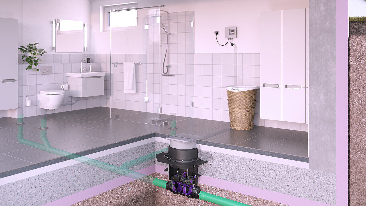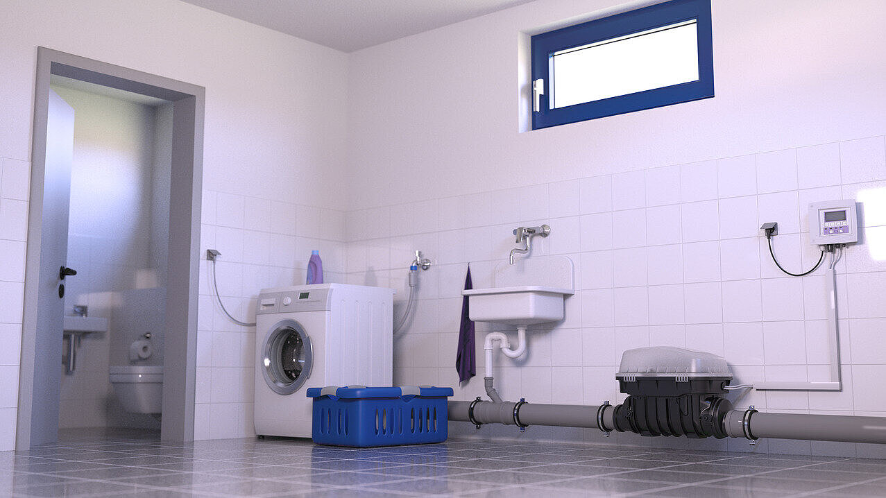 Le clapet antiretour peut être pose encastrée en dalle et peut également être installé dans du béton étanche au moyen d'une rallonge avec bride centrale et barrage d'humidité en élastomère. Le couvercle de finition avec siphon intégré veille à ce que les eaux de surface accumulées par exemple soient refoulées dans le canal malgré le refoulement en cas de rupture de tuyau.