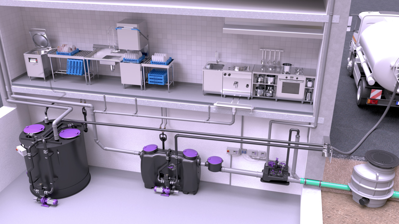 Grâce au dispositif de pompage intégré, les résidus alimentaires broyés sont acheminés dans la cuve raccordée.