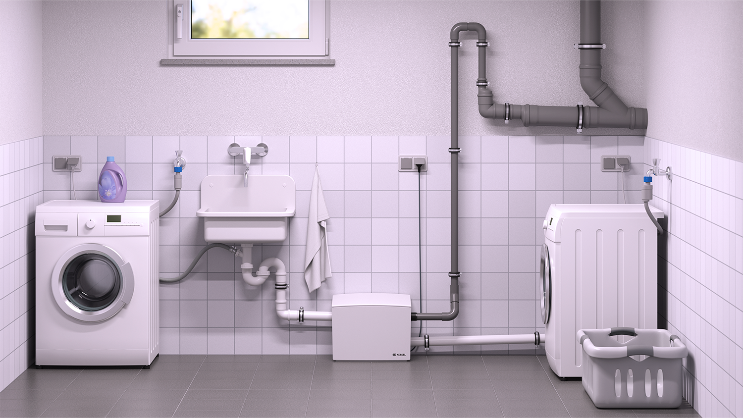Le nouveau Minilift L hors sol dispose d'un raccord de refoulement au choix à gauche ou à droite. Une machine à laver, une douche et 3 autres arrivées peuvent y être raccordées simultanément. Le Minilift L est livré prêt au raccordement, équipé de pompes de 300, 500 ou 1000 watts avec interrupteur à flotteur.