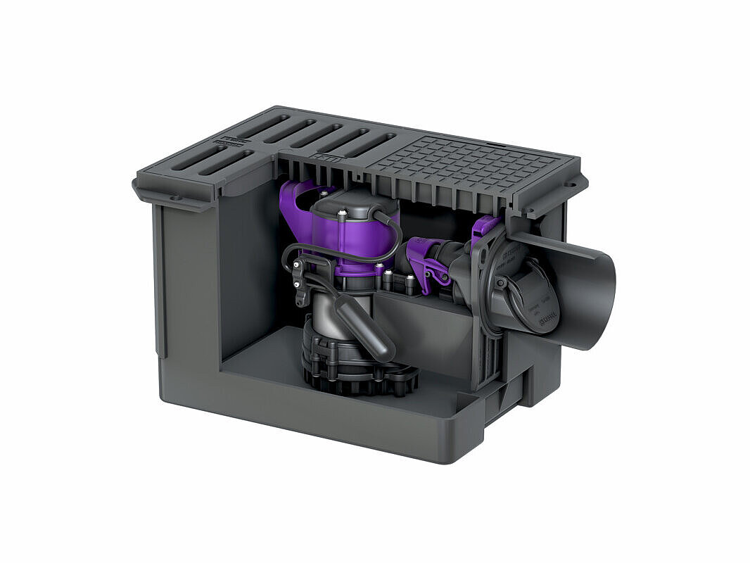 Plus fort que le reflux : le système Pumpfix S Underfloor est le seul siphon de cave à clapet anti-retour et verrouillage manuel qui lutte contre le reflux par pompage. En temps normal, il évacue les eaux usées exemptes de matières fécales en continu par la pente libre vers la canalisation, en cas de rupture de canalisation d'eau ou d'infiltration de crues. Mais il montre sa vraie force en cas de reflux : la pompe s'enclenche alors automatiquement et le système Pumpfix S Underfloor évacue de manière fiable même contre la pression de reflux. Il est également parfait pour drainer une descente d'escalier de cave à l'extérieur.