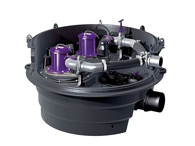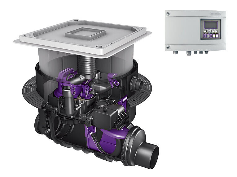 Le poste de relevage est un moyen éprouvé de protéger les points d'écoulement situés sous le niveau des plus hautes eaux. Il pompe les eaux usées par le biais d’une boucle anti-retour qui empêche efficacement l'eau de pénétrer dans la maison dans le sens inverse de l'écoulement. Pour beaucoup, le choix d'une protection anti-retour s'arrête là, même si les conditions sont souvent réunies pour économiser une grande partie des coûts d'électricité et de maintenance grâce à une solution hybride respectueuse de l'environnement. Ainsi, avant d'opter pour un poste de relevage conventionnel, il convient de vérifier soigneusement si la situation de montage nécessite réellement de faire fonctionner constamment la pompe.