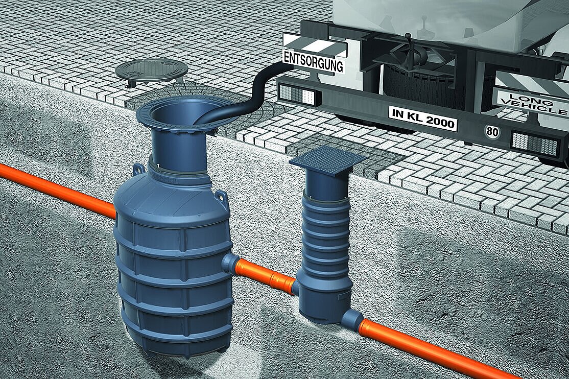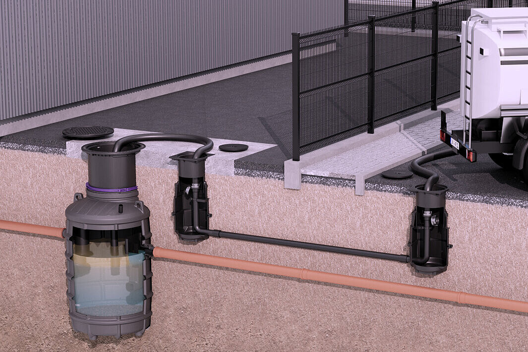 Le séparateur à graisses EasyClean ground Standard est la version de base de la gamme EasyCleanground. Pour la vidange et le nettoyage, il est nécessaire d'ouvrir les couvercles bombés étanches aux odeurs du séparateur à graisses. L'aspiration et le rinçage du séparateur à graisses s'effectuent manuellement. Le nettoyage s'effectue de préférence à l'eau chaude par les orifices de maintenance.